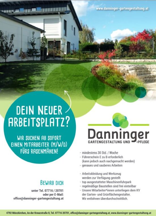 Wir sind ein innovativer, familiengeführter Gartenbaubetrieb in Münzkirchen. Wir planen, bauen und pflegen hochwertige Gärten und suchen zur ehestmöglichen Verstärkung unseres Teams folgende Stelle: